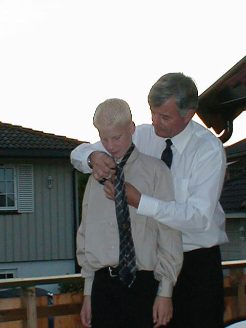 På tide å lære seg å knyte slips, med litt hjelp går det bra.