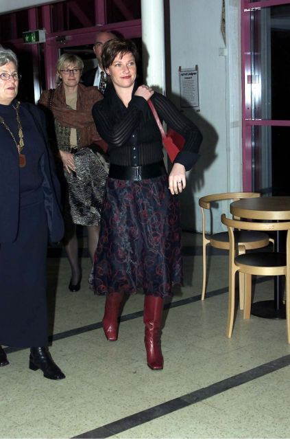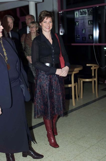 i Lørenskog i går. Iført stilig sort silkeskjørt, sort bluse og lange burgunderrøde støvletter smilte og hilste