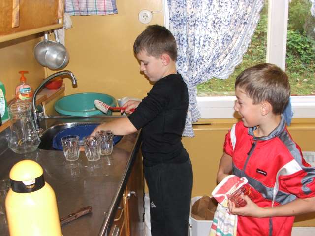 Også oppvasken måtte alle hjelpe til med.