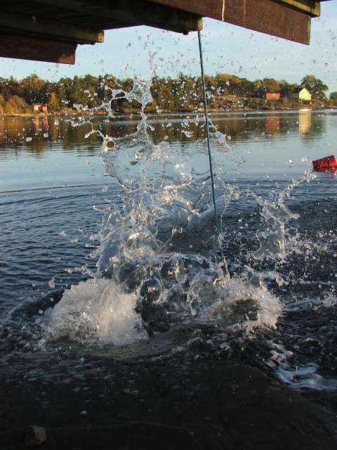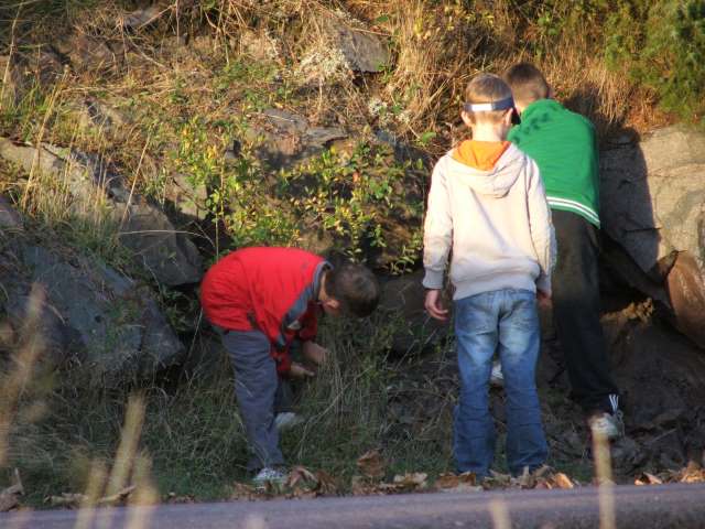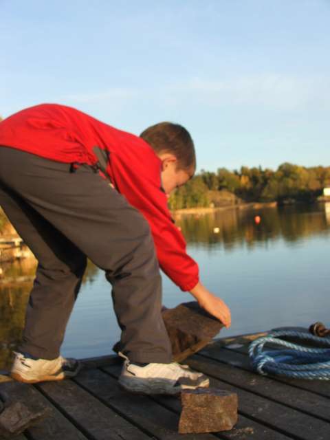 Plutselig får de for seg at de skal kaste store steiner ut i vannet for å lage størst mulig plask.