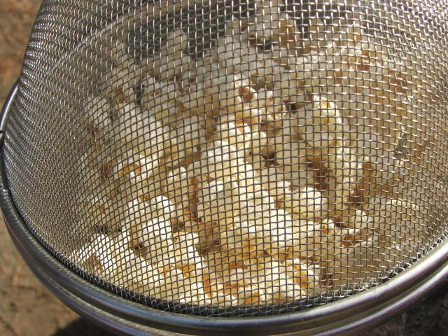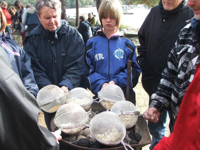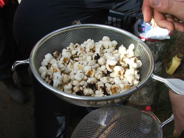 Poppkorn laget på bål smaker kjempegodt selv om det ble noen brente korn. |